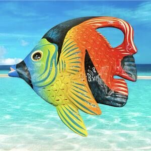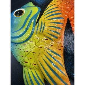 Large and colorful! Hand painted ceramic Angel Fish from Mexico. It is signed J. M. M. and has holes for hanging. It measures 7" tall, 6" long and 1.5" thick. A great addition to anyone's tropical decor! It is in excellent condition with no damage. It weighs 9.2 ounces.