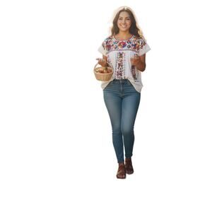 This gorgeous, one-of-a-kind Mexican blouse features exquisite hand embroidery, showcasing traditional craftsmanship. The vibrant colors and intricate designs make it a true statement piece. Perfect for adding a touch of bohemian flair to any outfit.