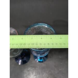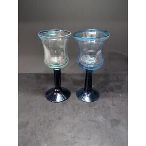 Mexican Handblown Wine Goblets, Clear Glass with Aqua Blue Rim, Stem, Set of 2
