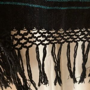 Beautiful black and turquoise Mexican handwoven shawl wrap featuring a detailed geometric pattern and hand-knotted fringe. Medium-weight cotton fabric drapes elegantly — perfect as a wrap, scarf, or shoulder cover for cool evenings.