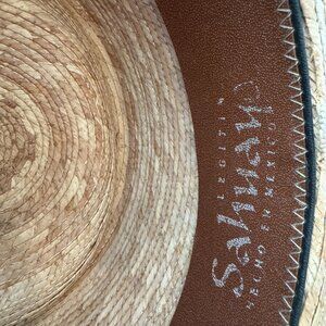 Lightweight palm-leaf straw cowboy hat with a classic telescope (gambler) crown and a brown leather hatband with cutout detail. Made in Mexico with a leather sweatband for comfort. Natural straw tone, breathable weave, and a generous brim for sun coverage—perfect for rodeos, ranch days, festivals, or concerts. Interior tag reads “Made in Mexico 54” (fits about US 6¾). See photos for the tape-measure shots and close-ups. Clean and ready to wear.
