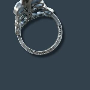 Elongated sterling silver statement ring with an open abstract scroll design, crafted in Mexico. Decorative and sculptural, the piece blends midcentury modernist and Nouveau-inspired lines. Stamped Mexico and 925, fits a size 6–6.25. Lightweight yet eye-catching, perfect for layering or worn solo. Good vintage condition with light surface wear consistent with age.