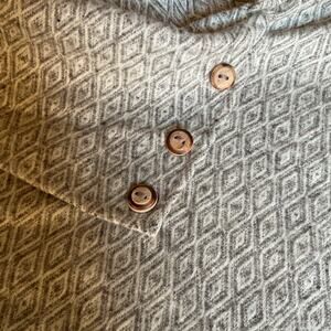 Handcrafted Mexican poncho made of wool with a light gray geometric pattern. Features decorative wooden buttons, a wrap-style collar, and fringed edges.