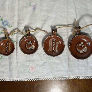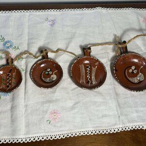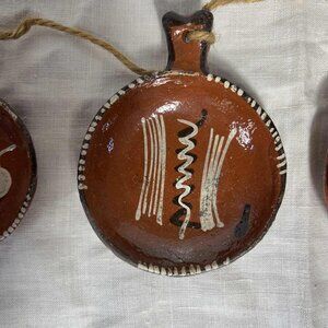 Traditional folk art from Mexico. (4) pieces of classic red clay pottery from 2-3/4” to 4-1/2”. Typical age appropriate patina with minor chips and scuffs. Very nice.
