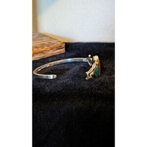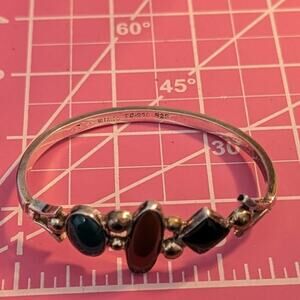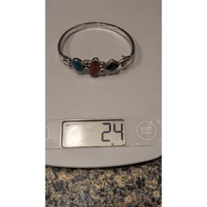 Mexico 925 Silver Three Stone Hook Latch Bangle Bracelet. Bezel set stones. Center stone is red, oval stone is green, and diamond shaped stone is black. Weighs 24 grams on my kitchen scale that rounds up. Widest point at center stone measures 15/16" wide. Pre-owned, this bangle is in excellent condition. There is a TG number stamped on in the inside as well as 925 and a hallmark I can't make out. Pre-owned, this bracelet is in excellent condition.
