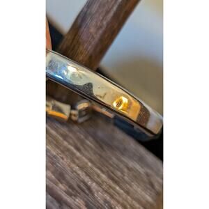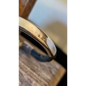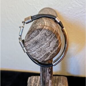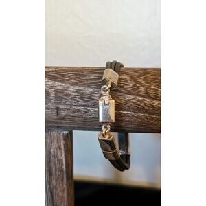 Mexico 925 Sterling Silver Three Cord ID Bracelet w/ Slide In Clasp. Pre-owned, this bracelet has a small dent in the face piece which I have tried to show in the photos, and also both insides of the cords have something like plastic coating where someone might have tried to fix. I would have this restrung on leather cords. I have discounted the price accordingly.