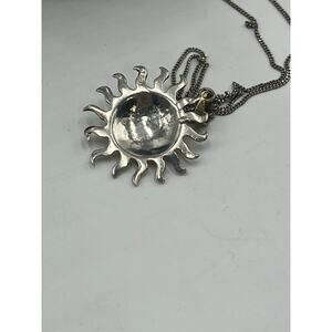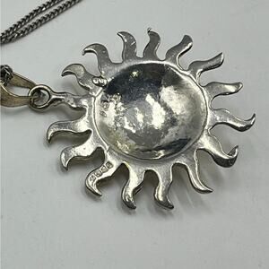 The design of the pendant, particularly the depiction of the sun with a human-like face and radiating rays, aligns with traditional Mexican folk art and silverwork, especially pieces from regions known for their craftsmanship like Taxco. Here we have a large and stylish sun god pendant made in