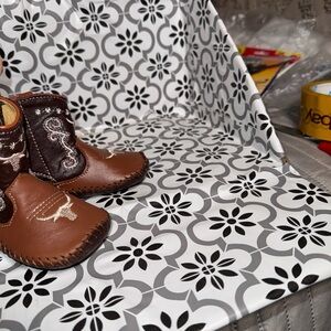 Meylan baby leather cowboy western boots. Unisex slip on with inner side Velcro for easy on off. All leather with rubber grip bottom for walker traction. Excellent condition with cushion bottoms great western bull design. Baby 6-9 months