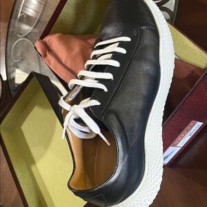 Sleek black leather with white accents. Comfortable and stylish for any occasion.