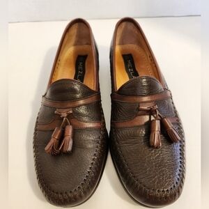 Mezlan Men's Brown Soft Pebbled Leather Kiltie Tassel Almond Toe Slip On Loafers Size 7.5 Made In Italy Business Travel Office Gently Used Excellent Pre-Owned Condition Reasonable Offers Welcome.