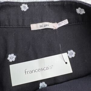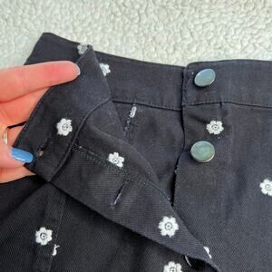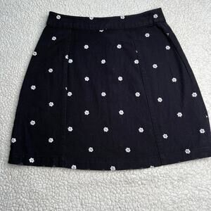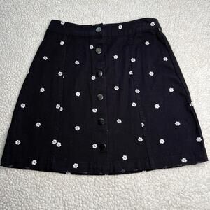 Mi Ami Floral Black Denim Button Up Skirt XS. Brand new and tags still attached. Black denim skirt with flowers embroidered on it. Has button closure up front of skirt. Approx measurements are in photos.
