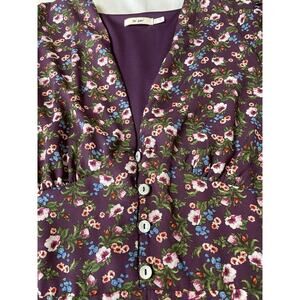 This is a Mi Ami Penelope mini dress in size S. The dress features a floral pattern in purple with ruffle accents. It has short sleeves and is suitable for various occasions such as travel, weddings, parties, and casual or formal events. The style is a mini dress with a feminine flower theme, ideal for the summer and spring seasons.