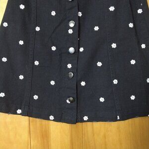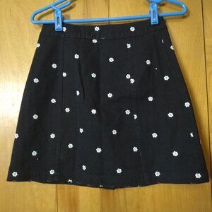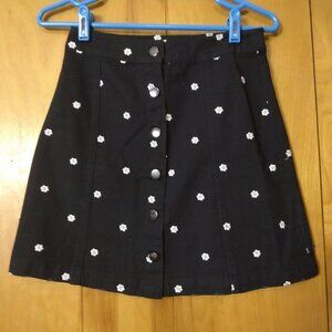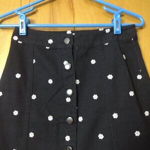 Mi Ami women's size XS black denim skirt with white embroidered flowers throughout. It has full button front closure.