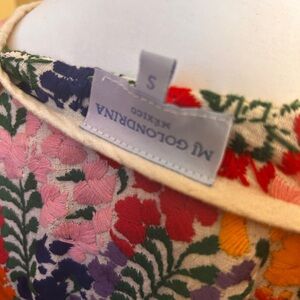 Features vibrant embroidery with slit pockets and billowy sleeves.