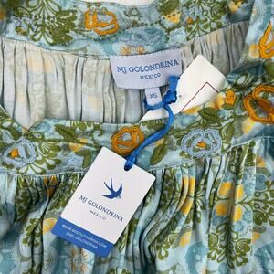New with tags, unused, no flaws or odors. Unlined with side pockets. Handmade in Mexico by a single artisan. Stunning embroidered neckline. Ties at the cuffs. Modest long sleeves and maxi length.