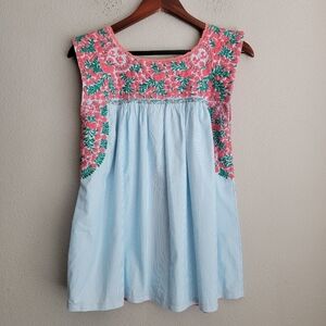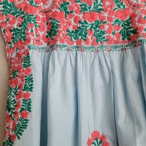 Our classic Flores blouse is 100% blue and white gingham cotton top with a loose, comfortable silhouette. The blouse features coral and green flowers in the upper bust. Hand-embroidered detail runs down the center of the blouse.