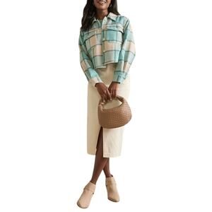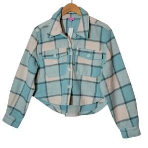 Mi ami Francesca Cropped Plaid Shacket Blue Cream Fall Winter Layering Jacket L