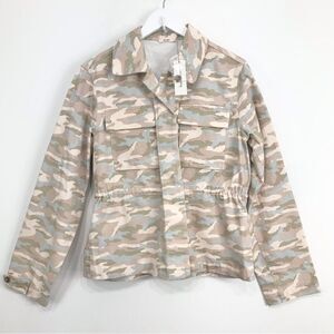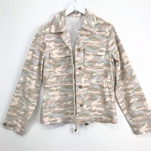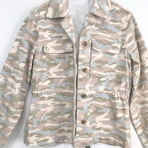 MiAmi Francesca’s Cream Tan Blue Camo Cinch Waist Button Utility Jacket NEW