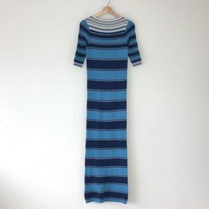 Gorgeous striped maxi knit dress with short sleeves and a boat neckline. Blue stripes with ecru neckline and metallic silver.