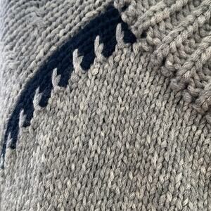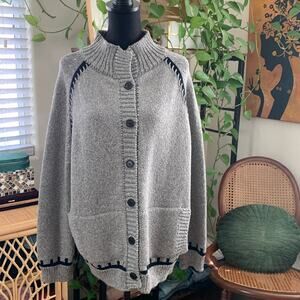Heathered gray with navy accent stitching. Knit. Button up. Long sleeve. Ribbed knit cuffs and waistband. Has pockets. 100% wool. Size medium. Excellent used condition - no rips, tears, or stains. Flat lay measurements are approximate.