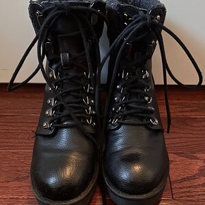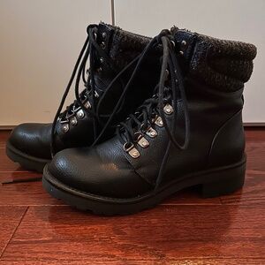 Mia black 6.5 Lindsey style boots. They are man made materials, and perfect for snow boots! They have a sweater like cuff. Ever so cute! :) Only worn a couple of times.
