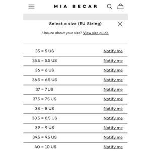 EU 39 which is equivalent to a US size 9 per size chart. The do run narrow and half size small according to the website so I would estimate they best fit a size 8 or a narrow foot 8.5. I typically wear a 8.5-9 (not narrow or not wide) and these are too small for me.