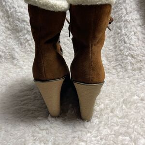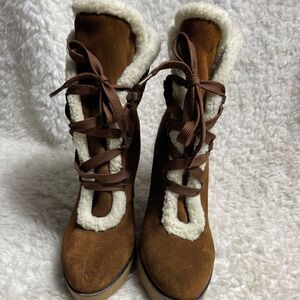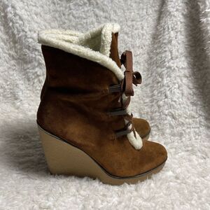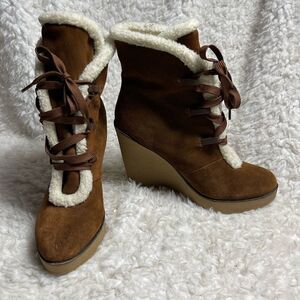 Mia Brown suede lace up wedge boots faux fur lining faux leather trim SZ10