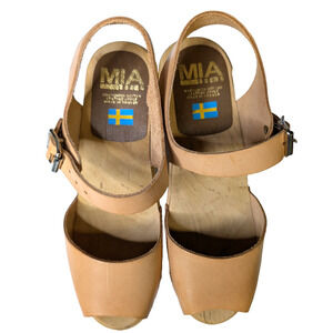 Mia Greta Wooden Heeled Leather Open Toe Ankle Strap Wedge Clog Scandi Boho Tan