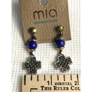 Mia Inspirations Inlay Cross Blue Bead Drop Dangle Post Earrings