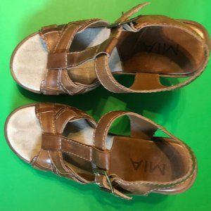 Mia Joplyn open toe, brown wedge sandals, contoured wooden wedge heels of 5 inches. Size 8, buckle straps, rubber soles, suede like footbed to keep the foot from sliding, excellent condition.