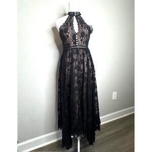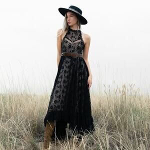 Wild west couture! Flowy High Low Black Lace Tiered Ruffle Midi Dress.
