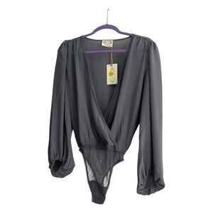 Mia Joy by Joyfolie Glennon Surplus Bodysuit in Slate Gray Sheer material. This Faux Wrap Front V-Neck Bodysuit has Long Bubble Sleeves and a Snap Closure. It will give you a stylish & sophisticated feel for all your days & nights out. The style possibilities are endless.