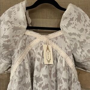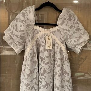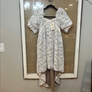 Elegant cream floral dress with a high-low hem. Features puff sleeves and a delicate pattern.