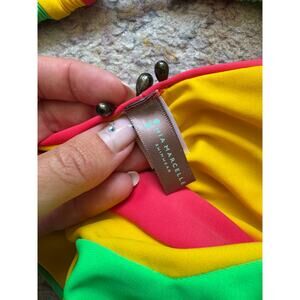 Bold, vibrant, and designed to turn heads, this Mia Marcelle bikini features a striking tri-color block pattern in coral, yellow, and green, perfect for standing out on the beach or poolside. The minimal-coverage design with adjustable string ties offers a flattering, custom fit for confident wear.