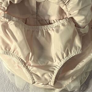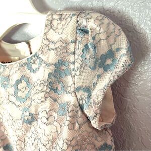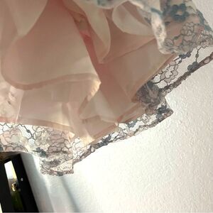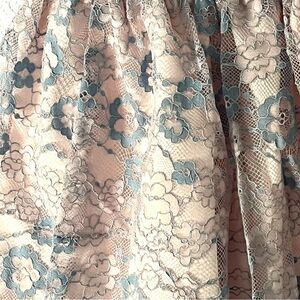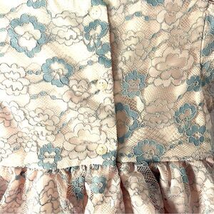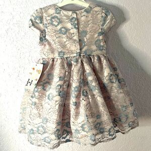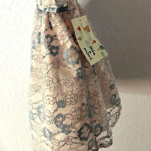 Adorable, Mia and Mimi lace dress in pink and blue floral lace over lining, tulle along the bottom of the dress underneath, which allows the dress to puff out beautifully. Cute little buttons down the top back of the dress make it even more adorable. Also has a cute pair bloomers. Perfect for your little girls, special occasion or dressy event.