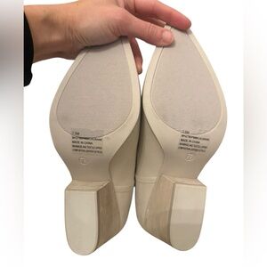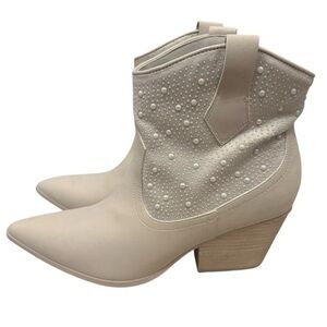 New without box! These chic ivory cream western-inspired ankle booties by MIA feature a pointed toe and a subtle pearl-studded dotted pattern that adds a modern twist to a classic style. Perfect for pairing with dresses, skirts, or denim, they’re also a gorgeous choice for bridal showers, bachelorette parties, concerts, or special occasions.