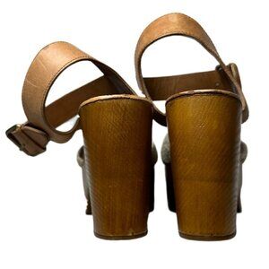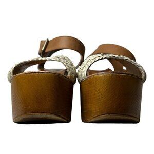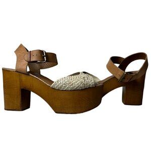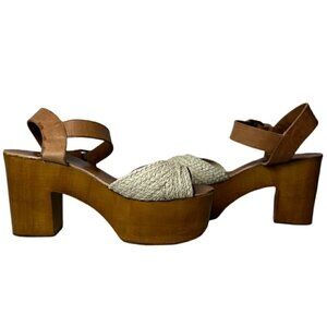 These Mia platform wood heel shoes boast a stylish look with an off-white crochet-like band and brown leather ankle strap. The wood platform heel adds fashion interest to any outfit. Enjoy these for any occasion.