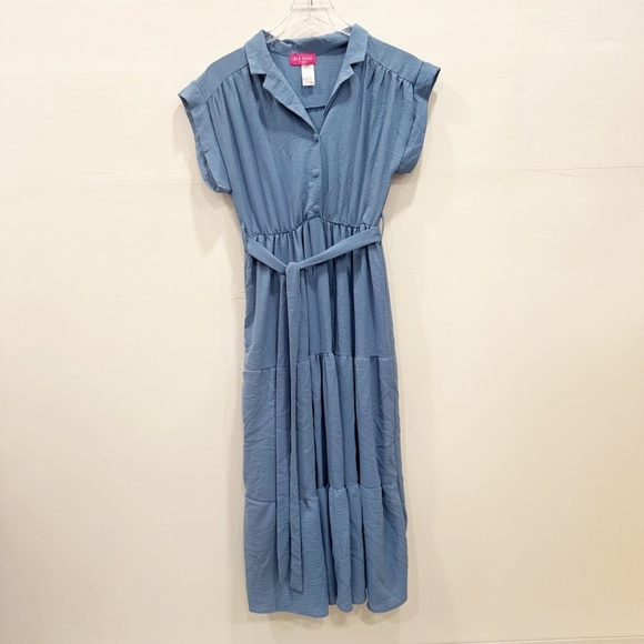 Mia Rose Blue Belted Tiered Midi Dress Belted Collared Button Front Medium