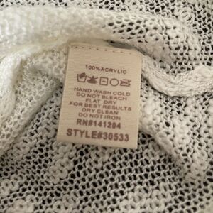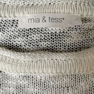 This is a Mia & Tess lightweight, semi sheer sweater in a women's size Large. It is a white sweater with a loose knit style and a blue star print. This would be perfect in the spring or fall or even on a cool summer evening or as a lightweight sweater at the beach. This sweater is in excellent preowned condition, like new. Measurements are included in photos.