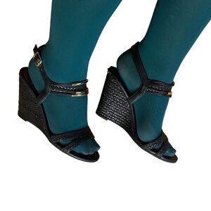 Mia Women Size 6 Black Ankle Strap Woven Wedge Sandal Shoe Gold Metal Accents