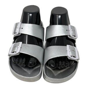 Lightweight and comfortable slip-on sandals ideal for casual wear, featuring a metallic silver finish and adjustable straps for a secure fit. • Double adjustable buckle straps • Slip-on design for convenience • Lightweight EVA construction • Metallic silver color for a modern look • Textured sole for grip Shoes are new with no defects. See photos for condition details. Non smoking home. Returns: Shoes must be returned in original condition with no signs of wear or damage in order to receive a full refund. Damage or use will result in a partial refund or no refund.