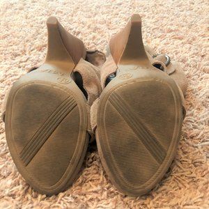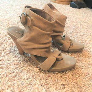 Lightly use women's sandal booties. Leather upper, suede feeling materials with wood stacked-heel and buckle around the back. Really cute for the warm months!