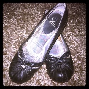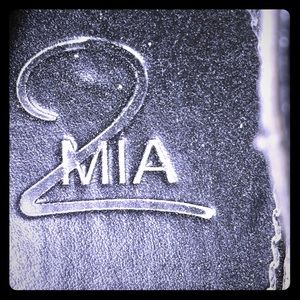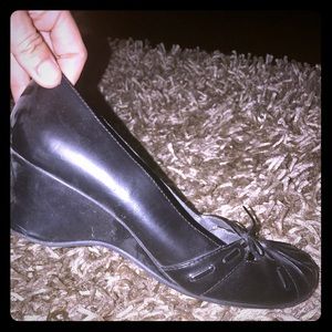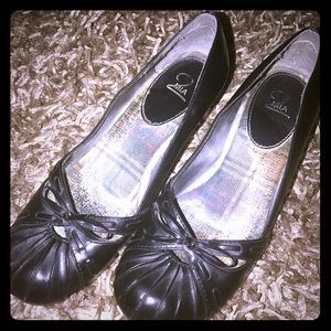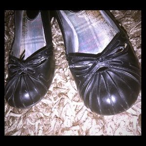 Mia2 Women's Size 7.5 Black 1" platform heeled slip-ons. Black leather with black leather stitching and bow at the toe. These are made to be cute and so comfortable! Perfect for work or church or every day.