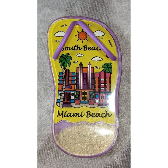Fun collectible magnet from Miami Beach/South Beach Florida It's purple, and depicts sunny skies, buildings and palm trees. It's shaped like a thong/flip flop sandal. The bottom is filled with actual sand from Miami beach. Fun souvenir!