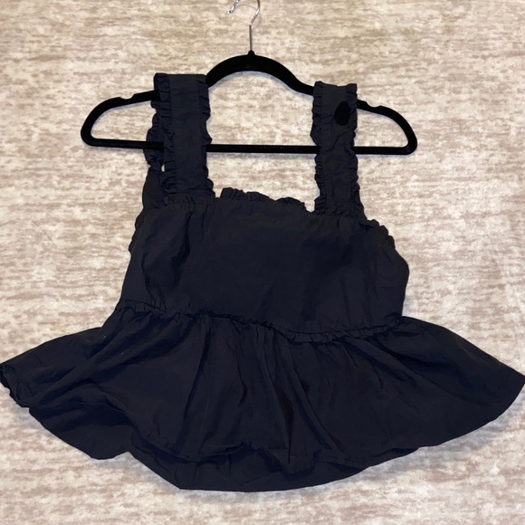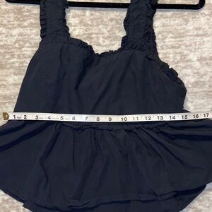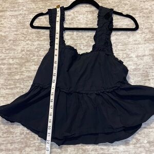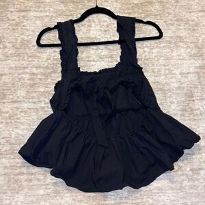 Stylish black tank top with ruffled straps and tie back. Flowy hem for a chic look. Perfect for casual outings.