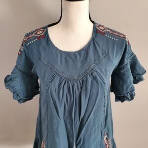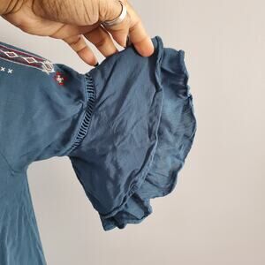 Miami hobo mini dress with Aztec print, ruffled sleeves and bottom., and a keyhole closure in the back. This lined dress is in excellent condition (no stains, no rips, or damage and comes from a smoke and pet-free environment).