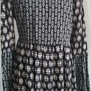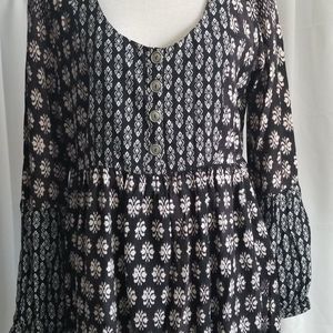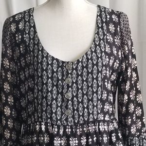 Miami Boho Dress Black White Print Buttoned Bodice Long Sleeve Size Large