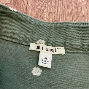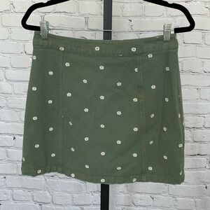 Denim material, button down front, cute floral pattern throughout, distressed hem line