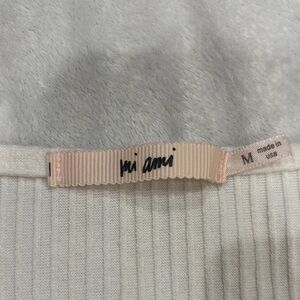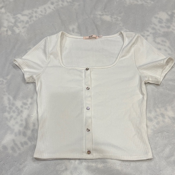 Stylish cream ribbed top with button-down front. Short sleeves and square neckline. Ideal for versatile wear.