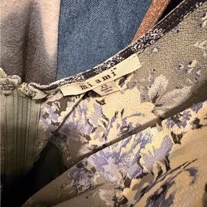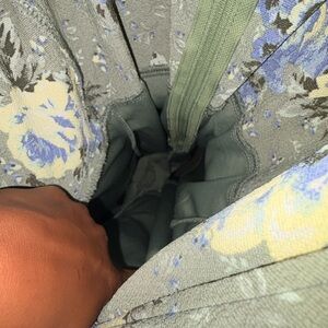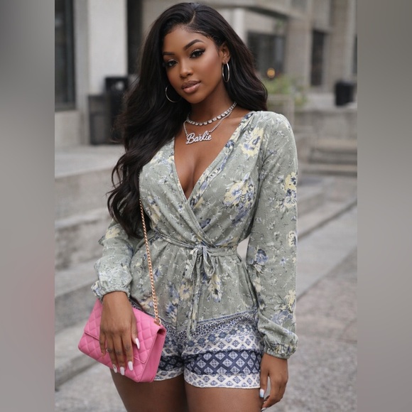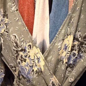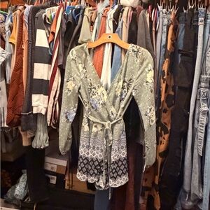 Elegant romper with floral design. Features soft blue and cream hues. Perfect for any occasion. No stretch, purchased from Francesca’s.
